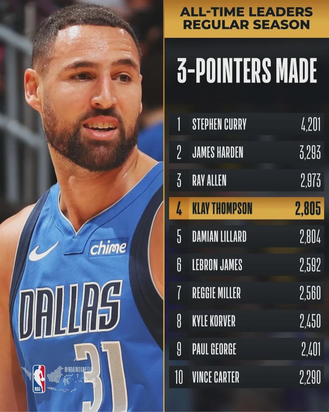 当然,克莱也没忘记感谢那些前辈:“父亲教会我要尊重前辈。没有雷吉-米勒和雷-阿伦,就没有今天的我。在我十几岁时,就痴迷地研究他们的比赛,包括无球跑位和命中关键球的能力。能和他们一起出现在这个榜单,很不真实。”